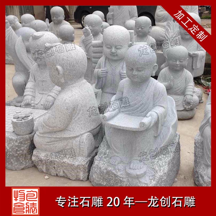 石雕精品小沙彌就是用優質石材雕刻制作的小和尚造型,一般都是10歲以下的孩童雕塑。由于小孩的天真爛漫,各種各樣有趣的造型都會做出來,比如下棋的小沙彌,睡姿的小沙彌、嬉戲的以及功夫小沙彌,打掃衛生的等等,也有一些修行的小沙彌造型,比如參禪打坐的造型,敲木魚的造型。石雕小沙彌的百態千姿是寺廟諸佛菩薩雕塑里面較多的一種,也是讓信眾們發自內心的喜愛和尊敬的一種佛教弟子塑像。