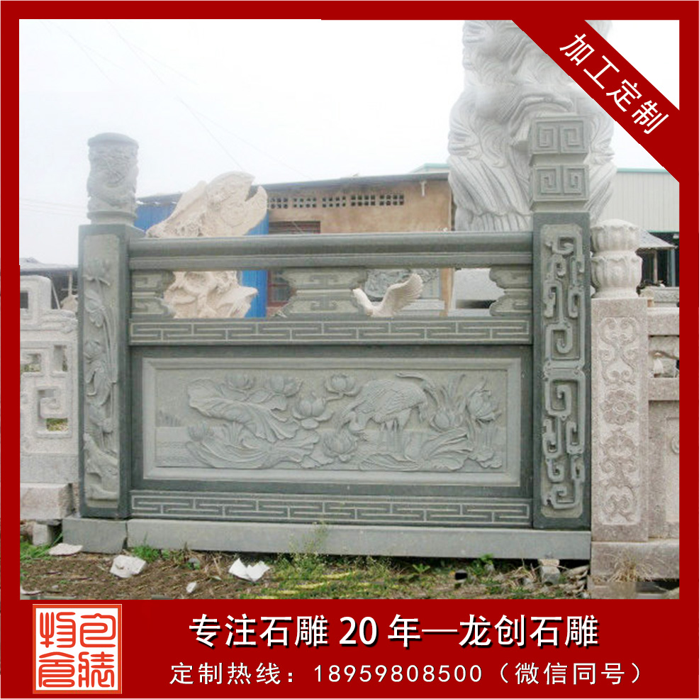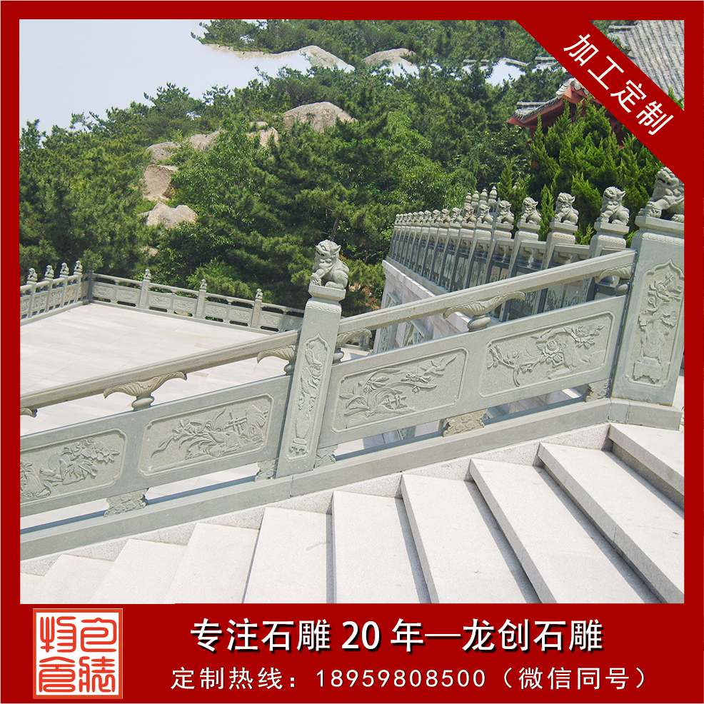 石雕欄桿不僅有安全維護作用,具有很好的裝飾效果。望柱柱頭常做成回雌形式,題材多為寓意吉祥的勸物、花頭等立體型;菊柱多飾成荷葉凈瓶形式,尋杖以線腳裝飾;欄板是重點裝飾的部分,常施以扮致的雌飾,題材廣泛,并與拄頭的內(nèi)容相呼應。由立柱、墊塊、柱頭、抱鼓、欄板組成的石欄桿有時尚、環(huán)保、美觀、不變形、抗老化的優(yōu)點,所以被廣泛應用于交通橋梁、水利、公園等護欄工程。它的種類多種多樣,各種石材都可制作,常見的還是漢白玉欄桿、花崗石欄桿和青石欄桿。