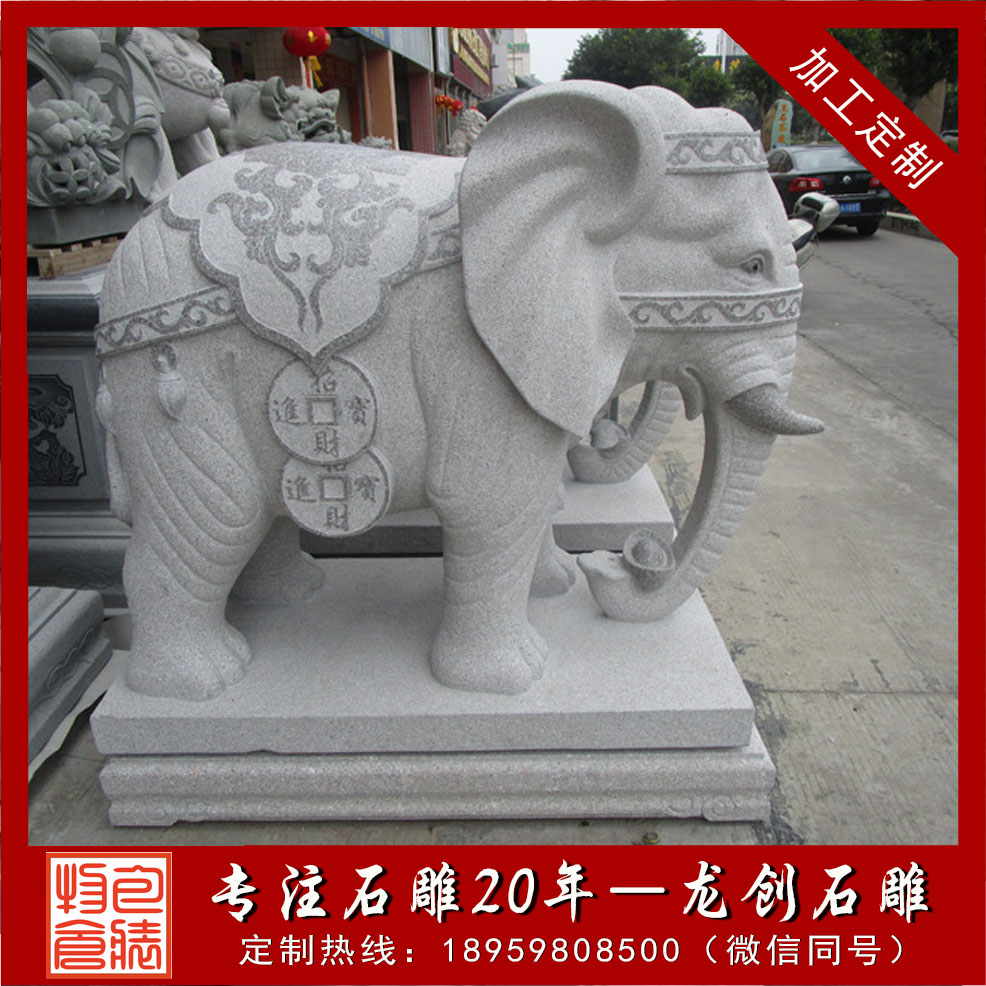 在家中擺放石雕象并不是什么時候都可以的事情,也有一個日期時間上的要求,其本身是一種風水動物,根據不同地區的風俗要求,在擺放上也都會有不同的要求。在實際擺放的時候就要先做好整體考慮,根據當地的風俗習慣等來對比,選擇到合適的吉日擺放,根據一些地域的特殊要求,擺放也都會需要挑選合適時期下圖是我們嘉祥縣長城石雕廠制作的招財石雕大象,石材芝麻白花崗巖,大象背上托的是元寶,適合擺放在公司、家庭、別墅大門口,我們還制作過寺院大象,他雕刻圖案一般是寶相紋,大象背上馱著蓮花、經書等佛教寶物。