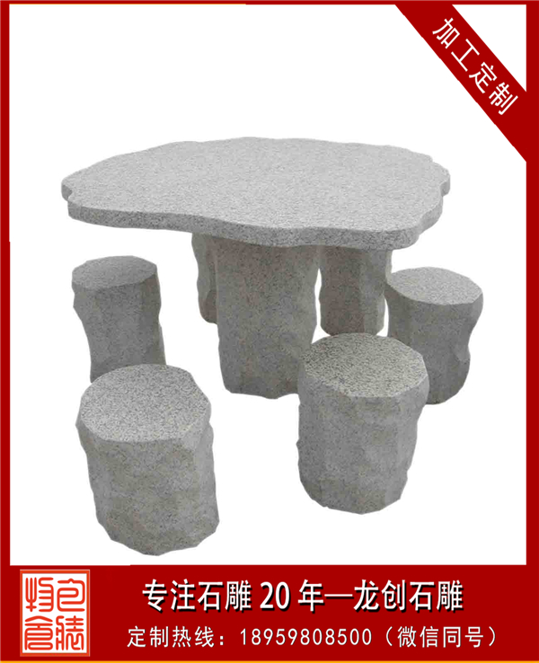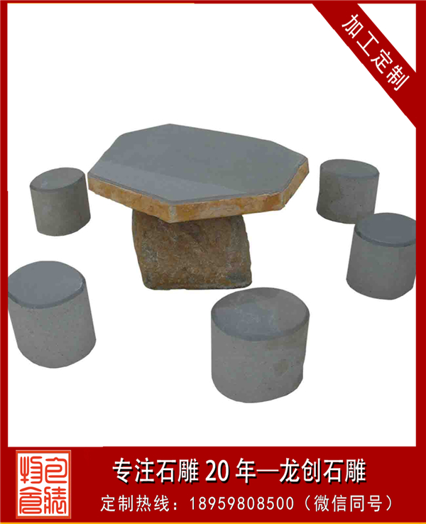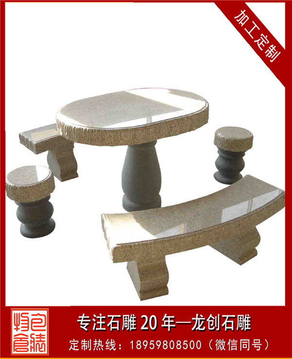 利用石材的石桌椅雖然堅硬,但是可塑性強,不易損壞,可制作造型多樣的石桌椅。最為簡單的石桌椅有由簡單修飾的圓柱坐凳與圓板組成的一組石桌椅,還有用幾塊石板組成的石靠背椅、長椅或者單椅等。還可以做進一步雕塑,可江坐凳打磨成葫蘆形或者雕塑各種花紋,還可將坐凳雕塑成動物坐凳、手坐凳等其他藝術(shù)造型。靠背椅還可仿沙發(fā)形狀來進行雕塑,可長方形也可做成弧形。長椅不單可做直線,也可做曲線,整石打磨或者把兩側(cè)做成動物造型。而單椅能雕刻成各種各樣動物造型,還能根據(jù)需要來選擇大小。
