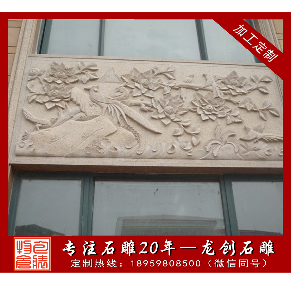 浮雕為圖像造型浮突于石料表面(與沉雕正好相反),是半立體型雕刻品。根據圖像造型脫石深淺程度的不同,又可分為淺浮雕和高浮雕。淺浮雕是單層次雕像,內容比較單一;高浮雕則是多層次造像,內容較為繁復。浮雕的雕刻技藝和表現體裁與圓雕基本相同。古今很多大型紀念性建筑物和高檔府第、民宅都附有此類裝飾,其主要作品是壁堵、花窗和龍柱(早期)及柱礎等。